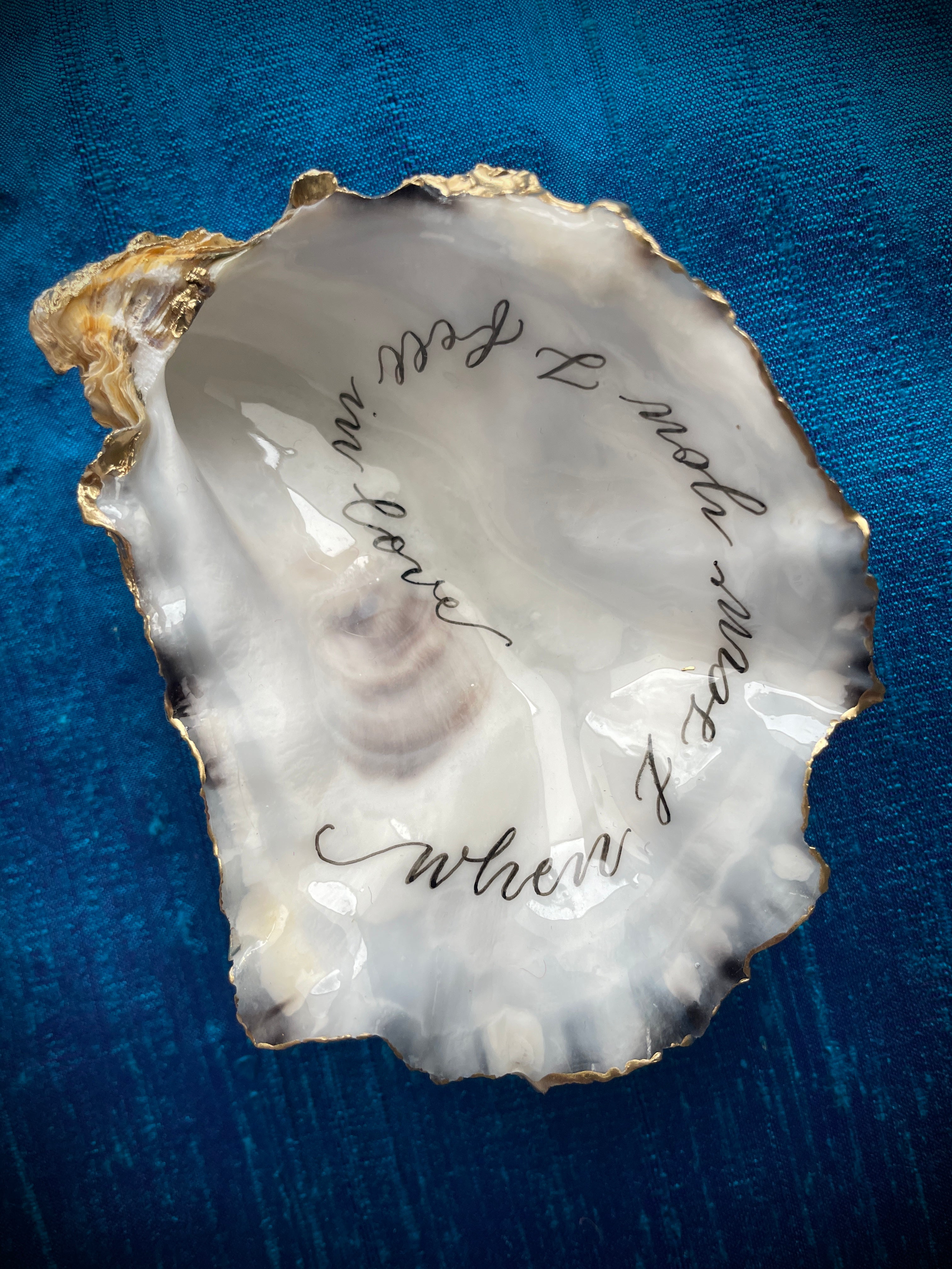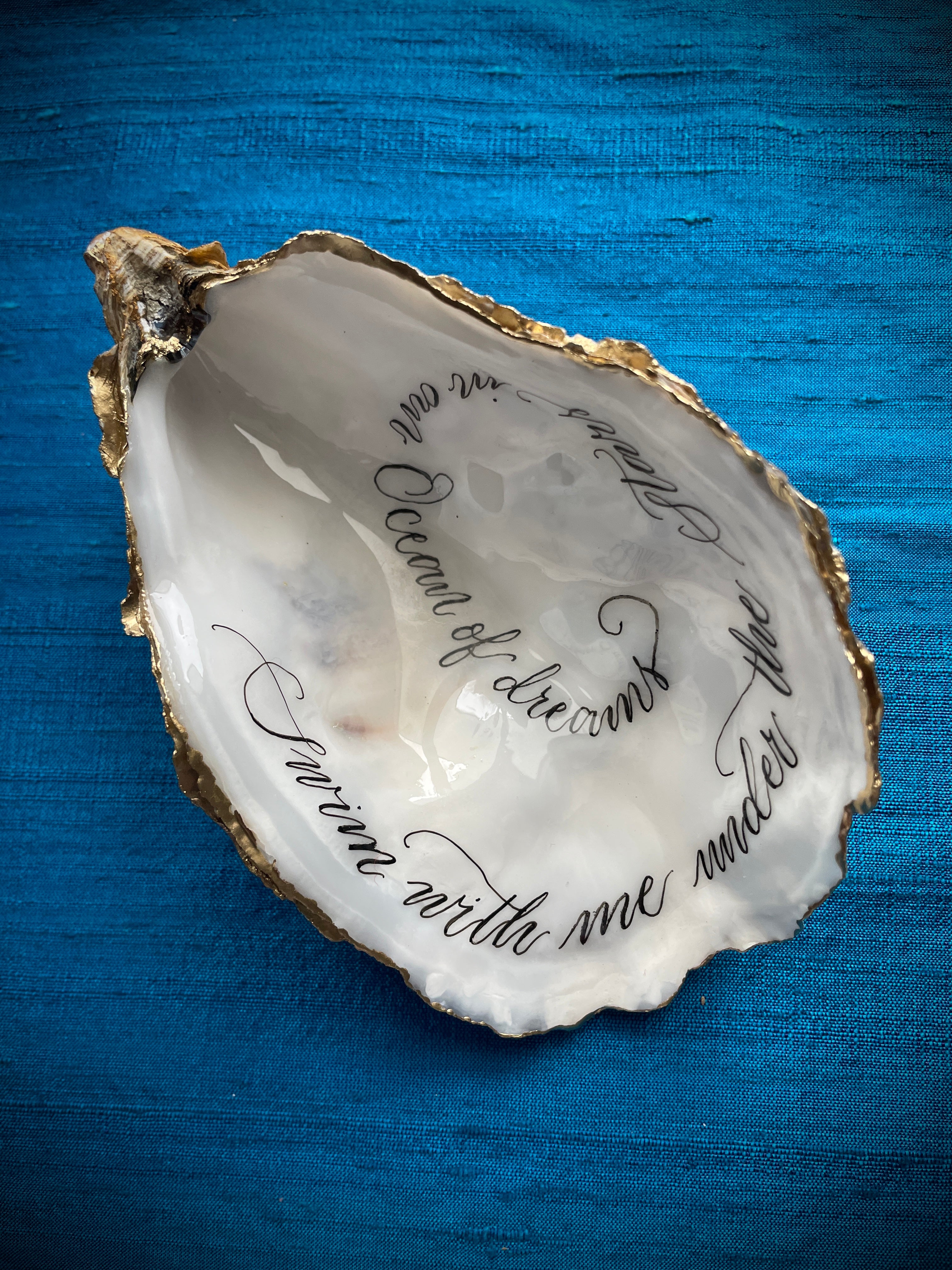 A fragment of ocean, gilded and inscribed, the natural iridescence of the shell catches light, while the hand drawn script spirals across it's surface like the sea's own handwriting.
