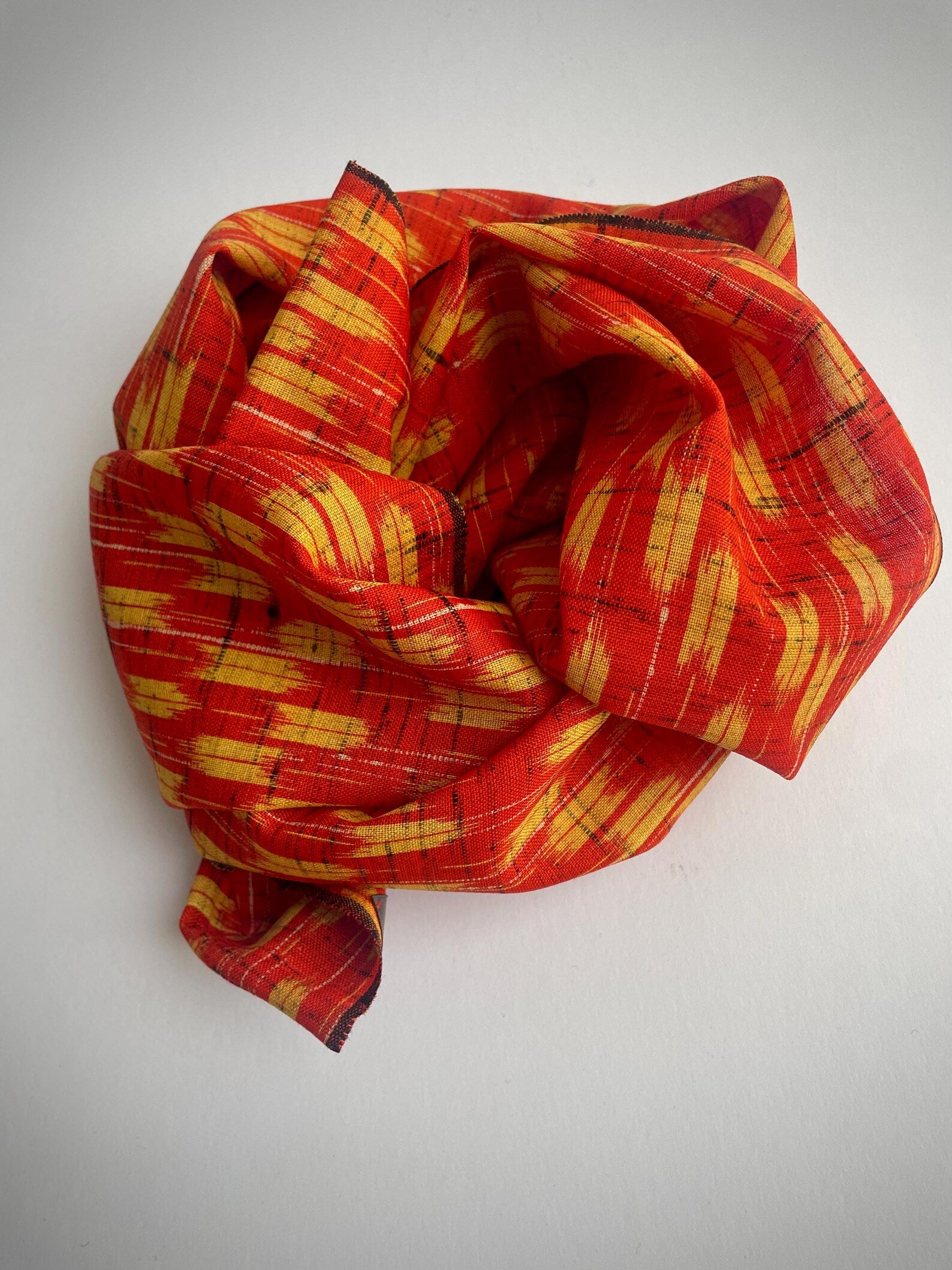 A length of woven Japanese history... patterned with Kasuri - the blurred edges of threads in deep indigo and white, softened by time, now reimagined to be worn again as a flowing scarf.