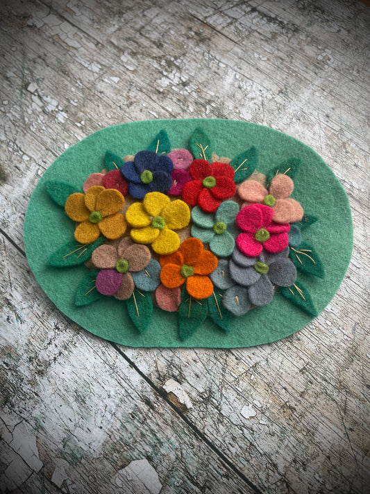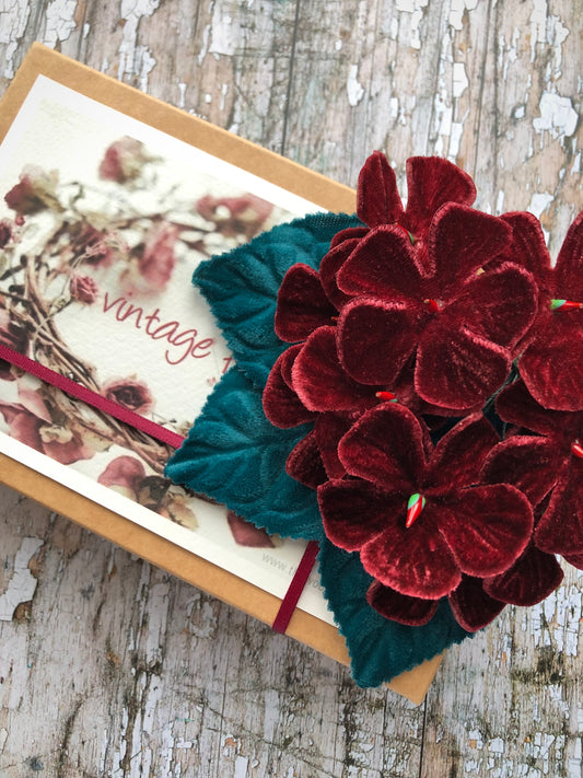 40's Style Vintage Velvet Flower Brooch Wine + Blue Leaves