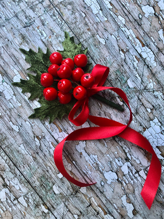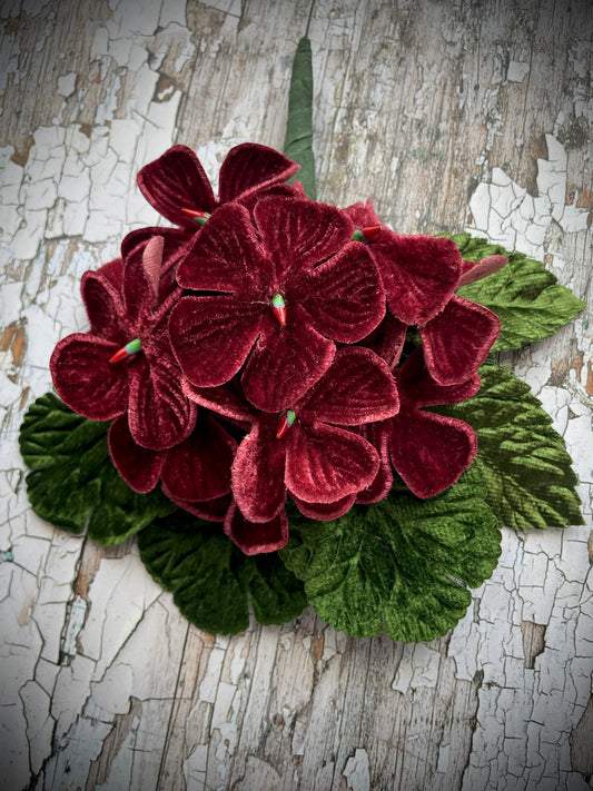 40's Style Vintage Velvet Flowers Brooch Wine + Green Leaves
