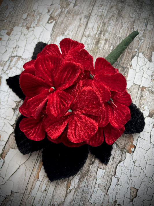 40's Style Vintage Velvet Gothic Flower Brooch Red + Black Leaves