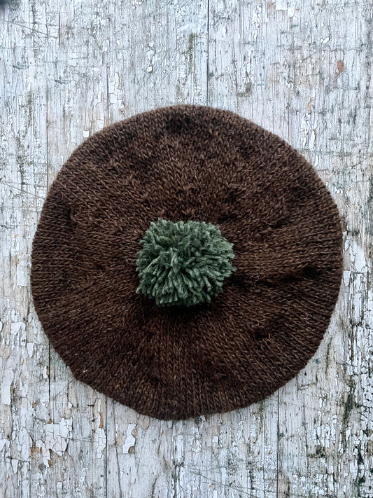 Beret hand Knitted In Dark Chocolate Brown + Sage Green Heather Wool