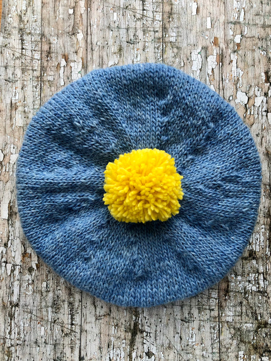 Beret Hand Knitted In Blue + Lemon Wool