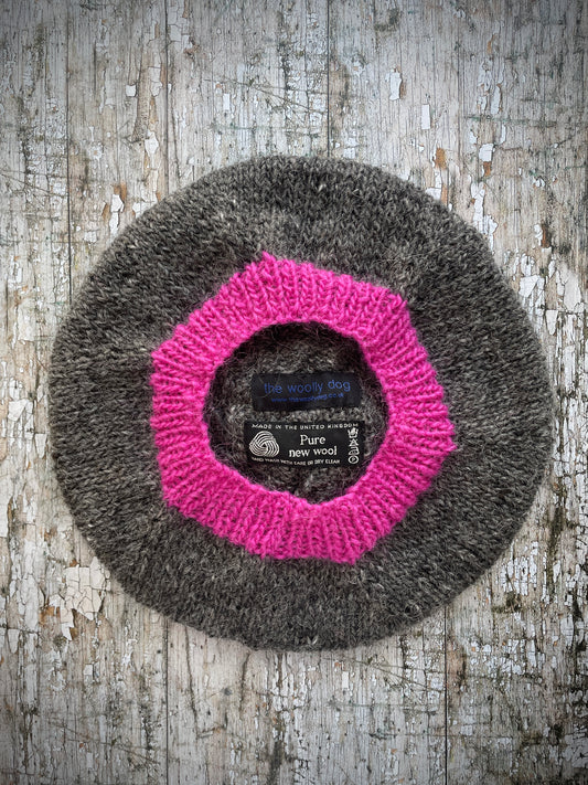 Beret Hand Knitted In Grey Tweed + Bright Pink