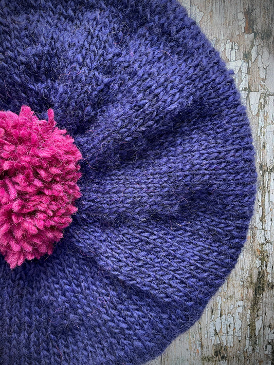 Beret Hand Knitted In Dark Royal Blue + Fuchsia Wool