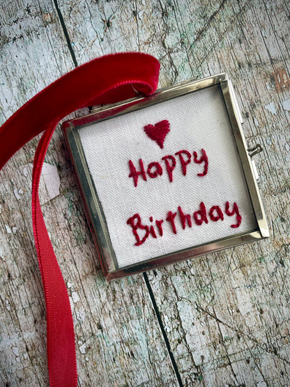 The words 'Happy Birthday' and a heart have been beautifully hand embroidered onto a piece of vintage French linen with deep red silk thread. It has been backed with a vintage floral cotton fabric, then placed inside a sealed small glass and silver coloured metal frame with a deep red velvet hanging loop. Perfect as a small birthday keepsake gift.